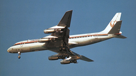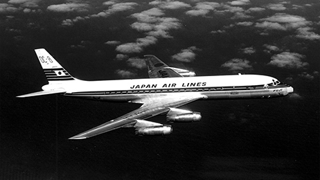 ジェット時代の幕を開けたDC-8は、長距離国際線を中心に一時代を築いた。「空の貴婦人」とうたわれた優雅なフォルム、卓越した性能に加え、客室に設けられた純日本風のラウンジや西陣織のシートなど「日本文化」を強くアピールしたサービスも評判を呼んだ。