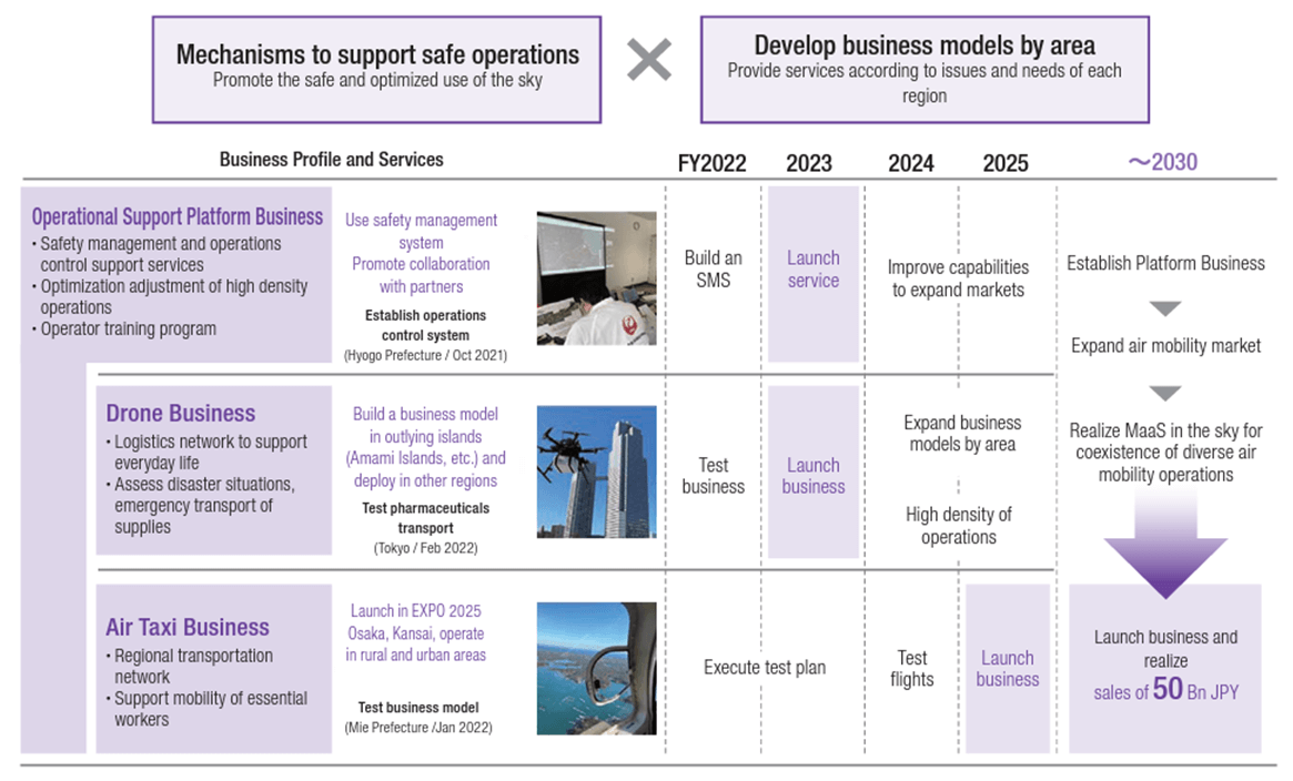 - Taking the opportunity of the Expo 2025 Osaka, Kansai, we will promote the commercialization of eVTOL and contribute to the realization of an exciting society and future in which people and goods can travel without restraint.