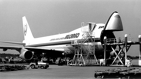 The 747-200F is a cargo plane developed from the 747-200B. The cockpit of the 747 was originally placed on the second deck in anticipation of its conversion to a cargo plane. The aircraft was equipped with a nose door that opened upward, allowing it to handle long cargo that to date could not be loaded on other cargo planes.