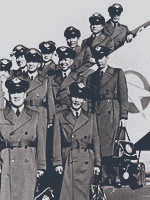 The second uniform of JAL's first generation stewardesses begin to be worn. (Winter Uniform: color/air force blue, material/dark blue pepper-and-salt gabardine, designed by Minoru Monta)