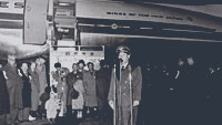 The Emperor Showa and the Empress Kojun board JAL jet plane (DC-8) to attend the National Athletic Meet in Kumamoto.