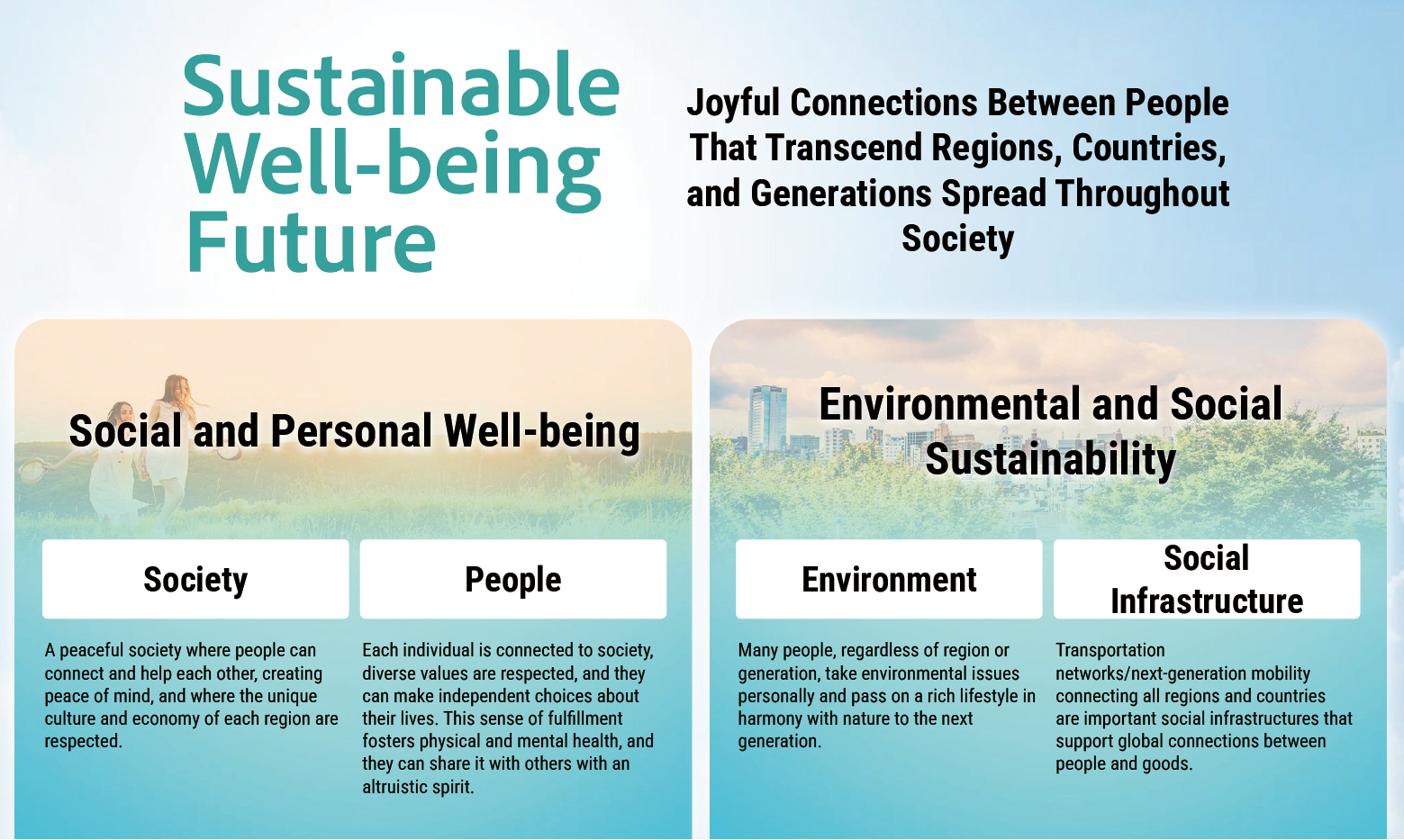 Our Envisioned Future is a sustainable and well-being future where joyful connections spread throughout society.