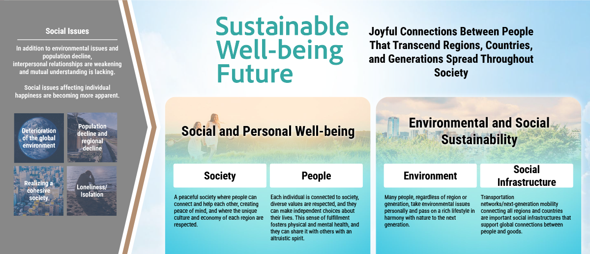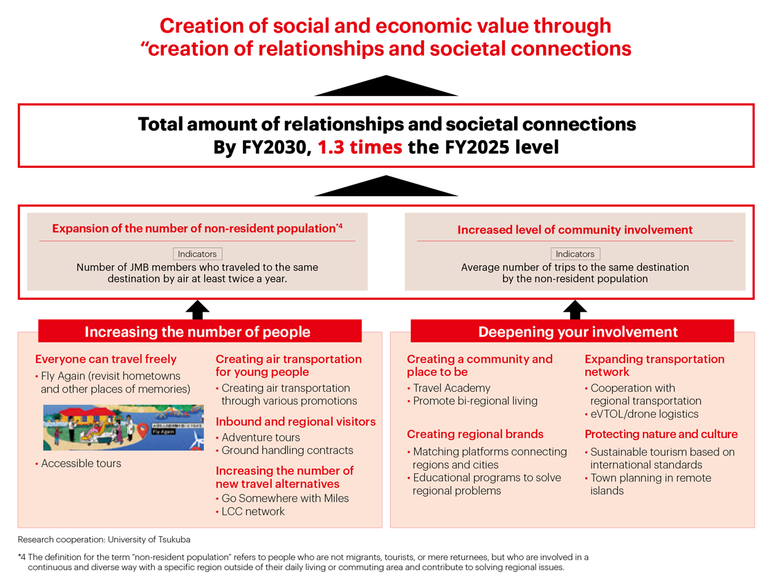 In order to build relationships and connections, the goal is to increase the “total amount of relationships and connections” by 1.5 times vs 2023 by fiscal 2030 by improving the “number of people involved” and the “level of involvement with the community". Specifically, the goal is to increase the number of people by expanding accessible tours and tourism that allow everyone to move freely, and to increase the level of involvement by creating a system to create communities and places where people belong, thereby creating social value such as regional revitalization by increasing relationships and connections and expanding human and commercial flows as well as economic value towards enhancement of the JAL Group's corporate value.