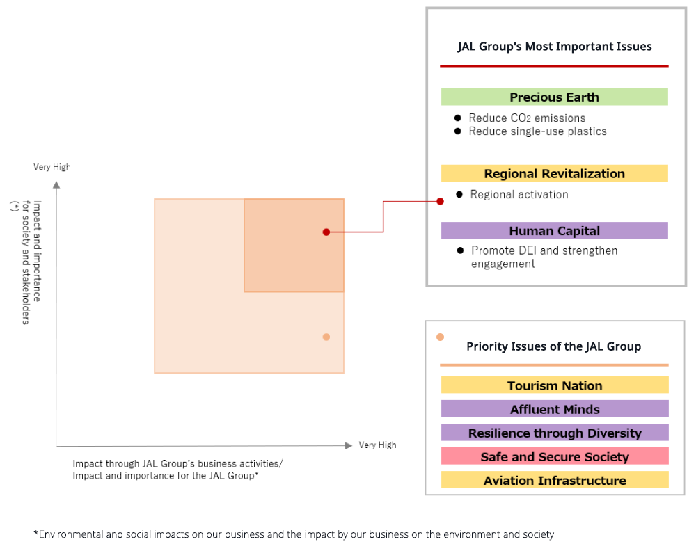 In 2019, the JAL Group defined four areas and 22 issues to be addressed throughout its business. We review our material issues annually, and in 2023, we reviewed them and defined eight new material issues based on changes in the internal and external environment.