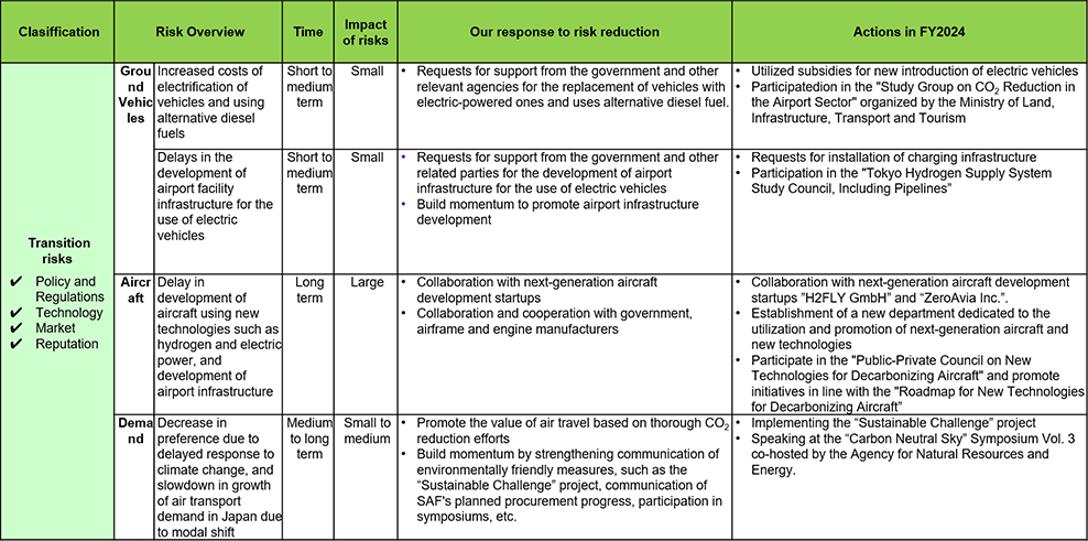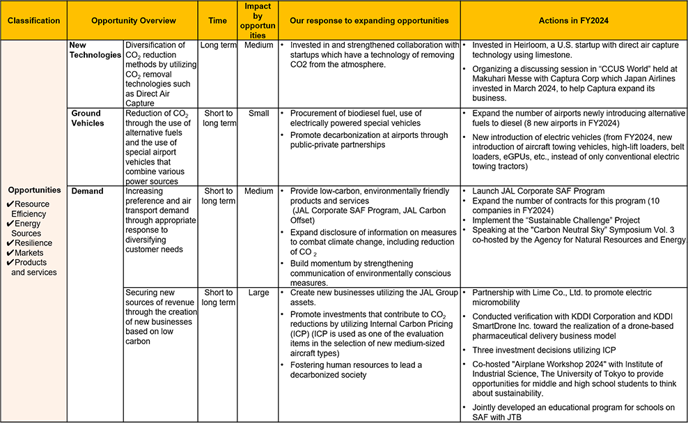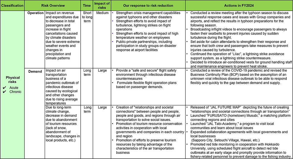 The JAL Group organizes and examines these factors that affect its business in accordance with the TCFD classification of risks and opportunities related to climate change and lists them in the table below. The classifications of "timing" and "impact of occurrence" are as specified below.