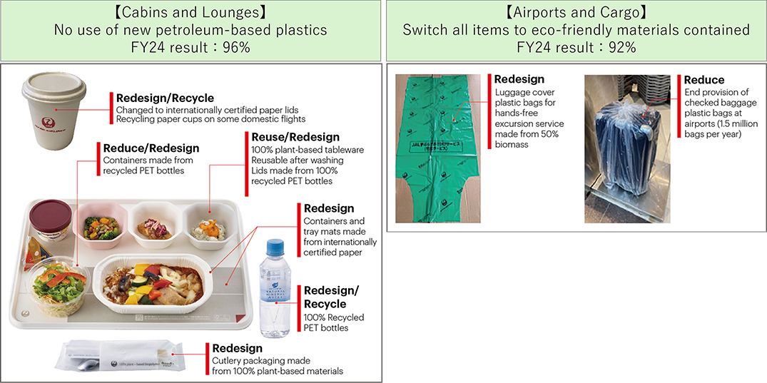 Through the promotion of the 3R (Reduce/Reuse/Recycle) +1 (Redesign), we have set a goal of phasing out all new petroleum-based single-use plastics in our cabins and lounges as well as switching all our single-use plastics used in airports and cargo to eco-friendly materials*6 contained by FY2025.