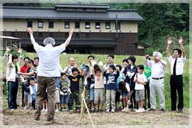 古民家を移築した大学創立50周年記念館「角間の里」の軒先に集まったのは、地元の小学生や金沢大学生、先生方など45名。