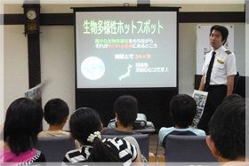 地球の環境と私たちの暮らしは、いろいろな生きものに支えられているんだよ。でも、その生きものたちが今ピンチに立たされているんだよ。」と説明を続けます。
