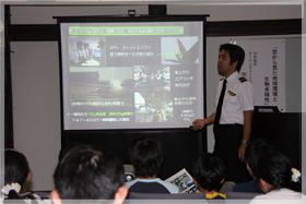 その燃料は飛行機のどこに積むのですか?などの質問があり、加藤機長が丁寧にお答えしました。