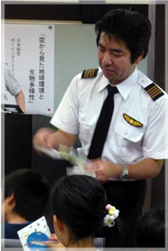 講師は、子どもたちと一緒に植樹したボーイング777の加藤機長。