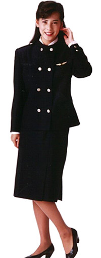 色は、キリッとしまった濃紺。ツートンカラーの帽子とスリットが入ったタイトスカート。上着はウエストを絞ったスタイル。カーディガンもあり。パンツスタイルもあった。