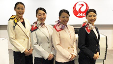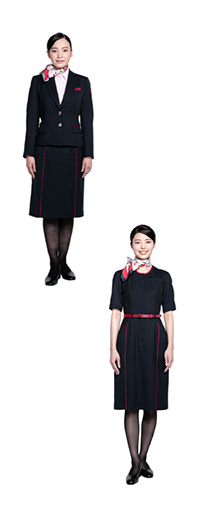 鶴柄プリントのブラウスを採用。事務スタッフは紺と白。旅客スタッフは紺と赤、貨物スタッフはワイン色が基調になるなど、色調によって各職種を識別できるのが特徴。