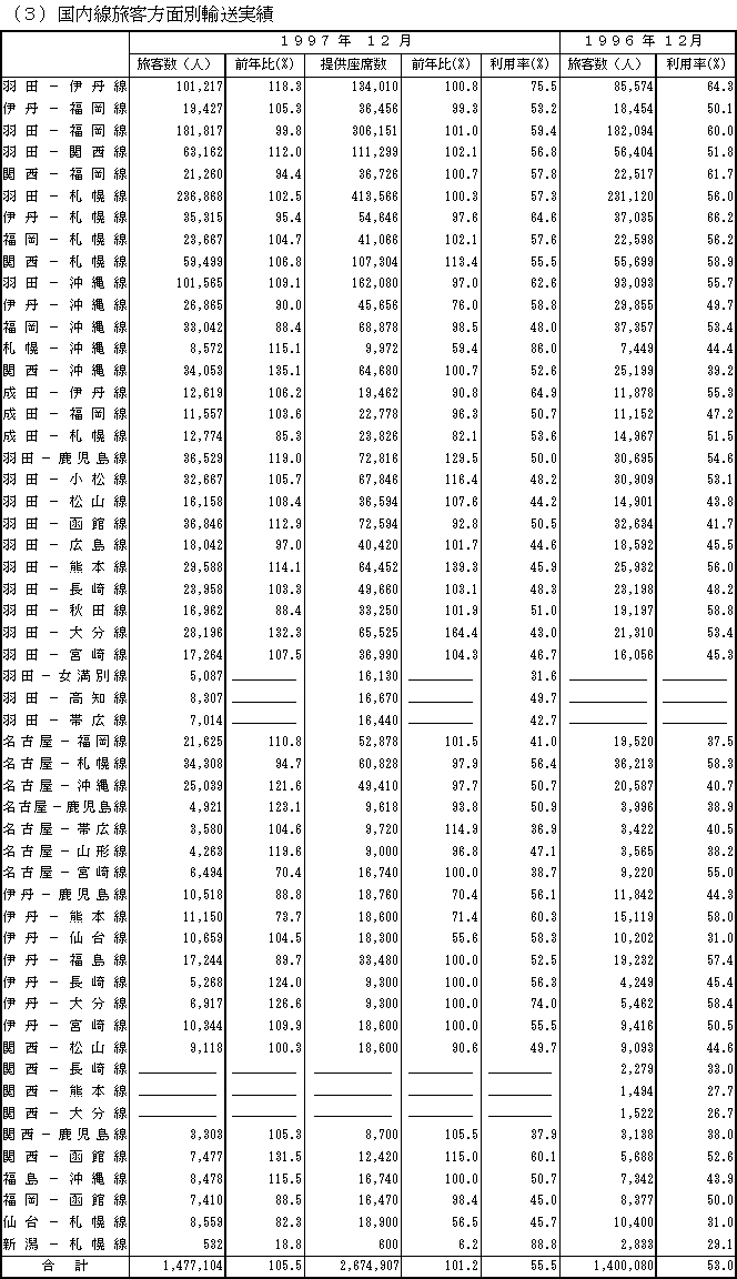 《国内線》 12 月の国内線輸送旅客数は147万7,104人、前年比105.5%、座席利用率55.5%となりました。個人旅客を主体とした羽田=伊丹線、伊丹=福岡線が好調なものの、他の路線は個人需要が前年割れとなっている路線が多く、予断をゆるさない状況となっています。一方団体需要は全般に堅調で、特に羽田=沖縄線、関西=沖縄線等の沖縄路線が高い伸びを示しました。