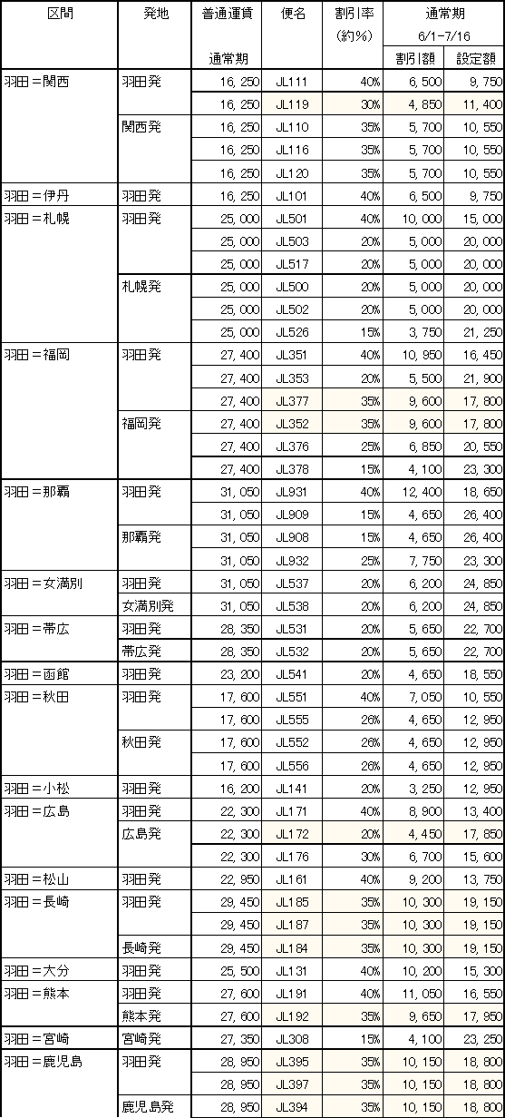 日本航空は、6月1日〜7月16日の割引運賃について、本日運輸省に届出を行いました。 今回当社が届け出た運賃の概要は以下の通りです。