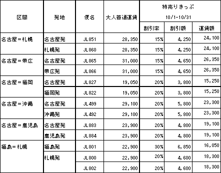 (4) 北海道路線北海道路線の「特売りきっぷ」を拡大し、皆様に親しんでいただけるよう「ほくほくきっぷ」と愛称をつけました。「特売りきっぷ 今回は、東京発札幌行き 7:30発のJAL503便にも20%割引で設定、また札幌発東京行き20:55発のJAL526便の割引率も25%に拡大(+10%)するなど、ご利用しやすい運賃設定をしました。尚、「特売りきっぷ (ほくほくきっぷ)」はご利用いただける座席数に制限があります。【特売りきっぷ(ほくほくきっぷ)拡大の概要】