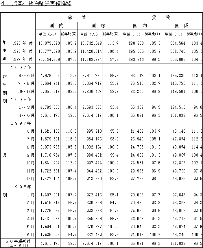 * スイス航空機材運航のみ。2. 1998年度夏休み期間(7/18〜8/17)の予約状況を発表 【7月15日】国内線(上下線) 2,104,388人 前年比 100.0%国際線(日本発着) 1,118,288人 前年比 99.0%