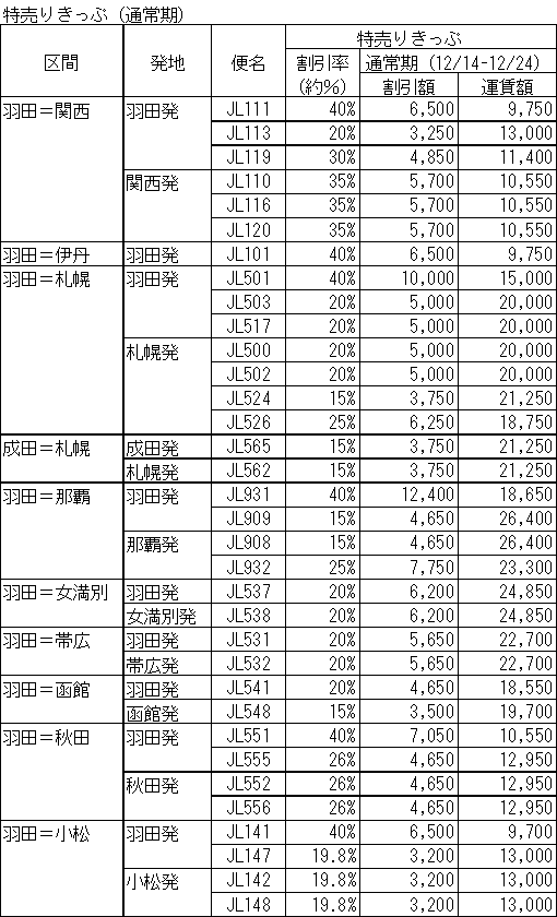 添付:「 12月特売りきっぷ一覧表」【別紙 @,A】