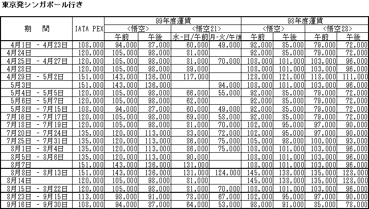 日本航空は、本日、既に発表(「 JAL NEWS」第99006号・1月28日)しました太平洋線、欧州線等の申請に引き続き、運輸省に1999年度上期(1999年4月1日〜1999年9月30日)の、アジア・オセアニア線のJAL悟空運賃(ゾーンペックス運賃)を認可申請しました。香港・タイ・シンガポール・オーストラリア線などに設定されています<前売り悟空28>は<前売り悟空21>となり航空券の発券期限が 1週間短縮されます。さらに、昨今の市場価格動向を反映して運賃額も大幅に引下げました。また、タイ・シンガポール等遠距離東南アジア行き運賃の有効期間を延長し(悟空: 21日→2ヶ月、前売り21:21日→1ヶ月)、よりご利用いただきやすくなります。なお、カナダ線・中南米線に関しても近日中に申請する予定です。 以 上【今回申請の<悟空><前売り悟空21>運賃と、 99年度上期IATAペックス運賃及び98年度上期JAL悟空運賃との比較一覧表】