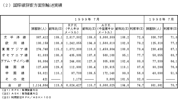 旅 客 《国際線》 7月の国際線輸送旅客数は111万4,664人、前年比113.5%、座席利用率74.7%となりました。 路線別には、全路線とも大きく前年を上回り、韓国線(129.6%)、グアム・サイパン線(127.8%)、東南アジア線(115.2%)、中国線(110.1%)が二桁の伸びを示し好調でした。