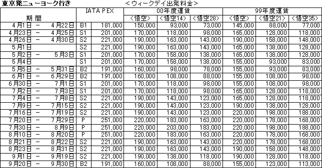 今回申請しました< JAL悟空>運賃を、2000年度上期IATAペックス運賃及び99年度上期JAL悟空運賃と比較しますと、以下の通りとなります。