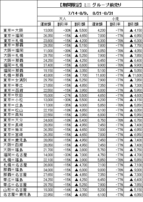 JAL は、7月から9月までの国内線運賃を以下の通り決定し、本日運輸省に届出いたしました。普通運賃につきましては、「ピ−ク期」を昨年よりも短縮して、 8月10日〜20日(一部路線は8月11日〜14日)といたします。割引運賃では、夏休み期間の 7月14日〜8月31日(8月10日〜8月20日を除く)の間に、家族やご友人とのご旅行などに便利な「ミニグループ前売り」を新たに全路線・全便で設定する他、「e割(インターネット割引運賃)」によるインターネット利用促進キャンペーンを7月1日〜7月23日まで設定するなど、高需要期にもユニークな割引運賃をご用意しているのが特徴です。JAL は、「前売り」・「特売り」・「e割」といった目的や時期に応じて使い分けることのできる多彩な割引運賃をご用意して、皆様のご利用をお待ちしております。主な運賃の概要は以下の通りです。尚、運賃額の詳細などについては添付資料をご覧下さい。 1 .「普通運賃」・「往復割引」「ピ−ク期」対象期間を、昨年度の *1 : 東京=大阪線、東京=広島線、東京=秋田線、東京=小松線、名古屋=福岡線、大阪=福岡線の「ピ-ク期」は8月11日〜8月14日の4日間に短縮いたします。また、往復割引については、 7月1日〜7月13日および9月1日〜9月30日の期間は現行と同じ運賃額、7月14日〜8月31日(除く8月10日〜8月20日)は、昨年度のピ-ク期普通運賃対比約▲2%のレベルで設定いたします。2 .「前売り」期間限定「ミニグループ前売り」登場! =楽しい夏休みの「ファミリ−旅行」に最適!小児運賃は「半額のさらに半額」!= 7 月14日から8月31日(除く8月10日〜8月20日)までの間、「ミニグループ前売り35」を新たに設定し、「前売り」をさらに多様化いたします。これは2名以上の小グループで、ご出発の35日前までにご予約される場合は、大人で最大39%割引、平均15%〜20%割引になり、お子様は小児運賃のさらに半額(大人普通運賃の約78%割引)という大変お得な割引運賃が適用になるというものです。例えば東京=札幌間を大人1名、小児2名でご利用の場合、普通運賃より16,800円もお得です(*2)。ご家族やご友人とのご旅行などに是非ご利用下さい。尚、「前売り 21」は、7月1日〜13日、9月1日〜14日,18日〜30日の間設定いたします。*2 :「ミニグループ前売り」運賃の例東京=札幌線の場合