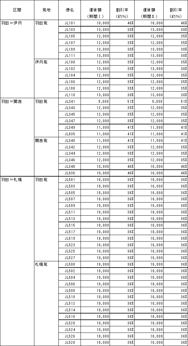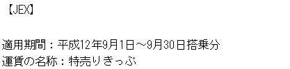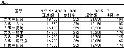 *9/15 〜9/17には設定がない便があります**9/15 〜9/17には設定がありません*** 金〜日・祝の675便/672便/676便2.「e割」 ・設定期間: 2000年9月7日〜2000年10月6日・設定便: JAL・JTA・JEXの全路線、全便・割引率( JAL):9月7日〜9月14日・9月18日〜9月30日:最大29%、平均26%9月15日〜9月17日:最大20%、平均17% 3.「前売り 21」(変更)・ JEXが大阪=宮崎線、大阪=鹿児島線に設定していた「前売り21」の割引率を拡大。以 上 * 添付:JAL・JTA・JEX運賃一覧表(9月ダイヤについては現在調整中です)