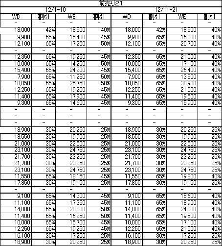 【 ・ ・大阪発着 6路線(仙台、大分、長崎、熊本、宮崎、鹿児島)の「前売り21」運賃を更に値下げ致しました。【 JTA】・ 「特売り」は、 11月についても10月と同数便(JAL:171便、JEX:24便、JTA:26便)に設定致しました。また、JL908便(那覇=羽田)については割引率を拡大し、10月よりますますお得にご利用頂けるようになりました。「前売り21」の値下げも行い、JALグループは国内線割引運賃の更なる充実を図り、皆様のご利用をお待ちしております。なお、運賃の詳細につきましては、添付資料をご参照下さい。 以上 添付資料 @: 2000年11月のJAL「特売り」運賃表A: 2000年10月1日〜12月21日のJAL「前売り21」運賃表(太枠部が変更点)B: 2000年11月のJEX「特売り」運賃表C: D: 2000年11月のJTA「特売り」運賃表添付@