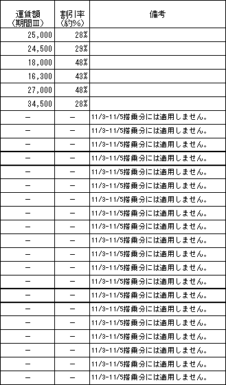 期間T:月曜日から木曜日(除く祝日)搭乗分 期間U:金曜日から日曜日、祝日搭乗分 期間V:11月3日から5日搭乗分 添付A