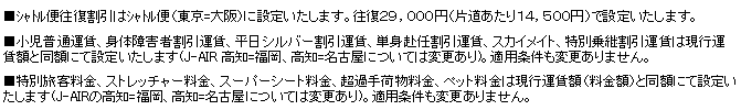 JALグループのJAL、日本トランスオーシャン航空(JTA)、JALエクスプレス(JEX)、ジェイエア(J-AIR)、琉球エアーコミューター(RAC)の各社は、2001年度上期の国内線運賃体系の概要を決定し、本日届出いたしました。 昨年2月の航空法改正に伴う国内運賃の自由化により、JALグループは積極的に割引運賃を拡充し、お客様のニーズに応えて参りましたが、新世紀幕開けの今年、新しいコンセプトの事前購入運賃を新設することといたしました。また、これまでの感謝を込めて、従来の割引率を大幅に上回る、「全路線全便5,000円均一の50周年記念運賃」を設定いたします。併せて、大変ご好評頂いている「e割」についても、2001年度の継続設定も決定しました。割引運賃の概要は、以下のとおりです。詳しくは添付資料をご覧下さい。なお、7月〜9月の一部割引運賃は、別途発表いたします。 1. 「前売りスペシャル」〜 事前購入運賃「前売り」の新しい形!分かりやすいエリア型運賃を、 お得な価格で! 〜 従来の幅広い期間設定の「前売り21」とは異なるコンセプトで、より短期集中化・割引深化の運賃を新設いたします。搭乗日2か月前の売出日から7日間限定で発売し、設定日は原則各月「5」の付く日(5日、15日、25日)。エリア別に運賃額を設定し、7,000円〜14,000円(割引率:最大74%、平均67%)という、分かりやすく、大変お得な運賃です。4月〜6月の設定日は下表をご参照ください。 例)