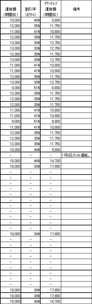 期間T:1月8日〜31日の月曜日〜木曜日(除く1月12日〜14日) 期間U:1月8日〜31日の金曜日〜日曜日(除く1月12日〜14日) 期間V:1月12日〜14日 ※上記「特売りきっぷ」運賃額に加え、「航空保険特別料金」の設定により、 お一人様・1区間毎に500円の負担をお願いしております。