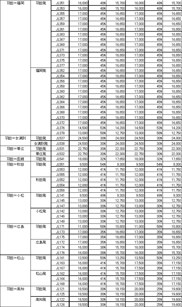 添付資料 @2002年1月8日〜31日のJAL・JEX「前売り21」運賃表(枠内が変更点) A2002年1月8日〜31日のJAL・JEX・J-AIR「特売りきっぷ」運賃表 B2002年1月8日〜31日のJTA・RAC「特売りきっぷ」運賃表