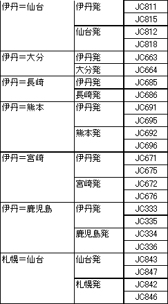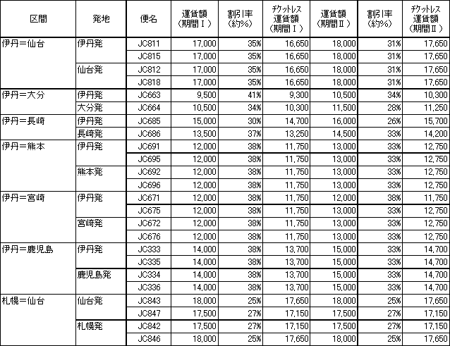 ○ 「特売り」:1月分新規設定 設定期間:2002年1月8日〜1月31日ご搭乗分 設定路線: ・JAL 24路線174便 割引率 25%〜58% ・JTA 10路線 33便 割引率 28%〜54% ・JEX 7路線 24便 割引率 25%〜41% ・J-AIR 5路線 18便 割引率 20%〜24% ・RAC 1路線 2便 割引率 26% ○ 「前売り21」:既に届出済の「前売り21」の一部を 500円〜2,000円値下げ 設定期間:2002年1月8日〜1月31日ご搭乗分 対象路線: ・JAL 東京=松山・福岡 計 2路線 ・JEX 大阪=仙台・大分・長崎・熊本・宮崎・鹿児島 計 6路線