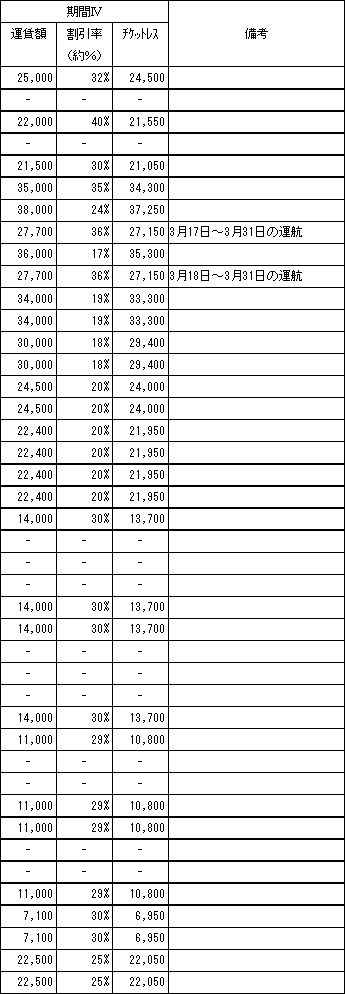 ■特定便割引「特売りきっぷ」 ○設定期間: 2002年2月1日〜3月31日ご搭乗分○設定路線:JTA 13路線40便、RAC1路線2便※期間によっては設定のない路線・便もございます。 ○最大割引率:約 54%○当該運賃の適用されるお席には限りがございます。