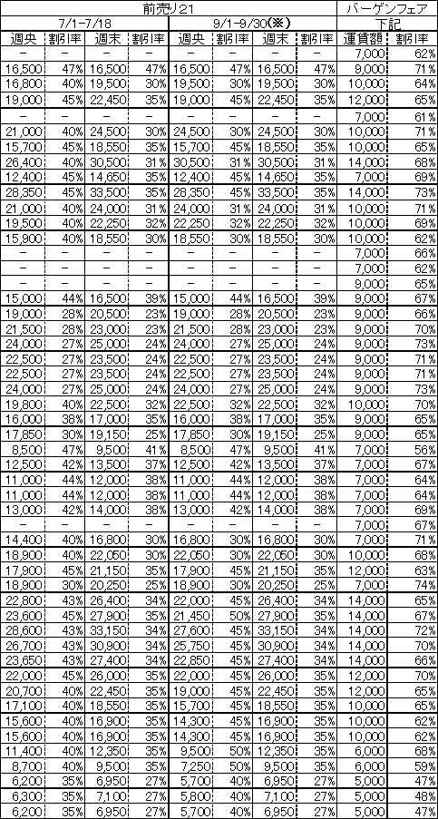 1. 「e割」〜 大好評につき、通年 (注)設定!〜国内初のインターネット運賃として、2000年度に導入した「e割」は、その利便性によりお客様に大変ご好評を頂いて参りました。 2002年度は、通年 (注)に設定いたしました。(注)但し、一部期間(上期については8/1-/20)を除く。 2.「バーゲンフェア」〜 好評につき、引き続き設定!〜 昨年8月から発売しました新エリア型バーゲン運賃「JALバーゲンフェア」は、わかり易さや大変お得な運賃設定が大変好評でしたが、2002年度は設定日を昨年下期同様、「毎月1週間以上の設定(除く8月)」として、お客様が利用し易い設定といたしました。 3.「特売りきっぷ」「前売り21」〜 木目細かさを加え、新たなお得を! 〜 「特売りきっぷ」は、東京=大阪を皮切りに、従来の便別割引に加えて、曜日別割引運賃を新たに設定致します。お客さまのニーズに合わせ、木目細かい運賃設定に努めて参ります。「前売り21」は、昨年に引続き利便性が高く、お得な運賃として設定して参ります。特にJALエクスプレスの大阪発着路線については、昨年より値下げいたしました。なお、「特売りきっぷ」運賃の届出は、別途行います。