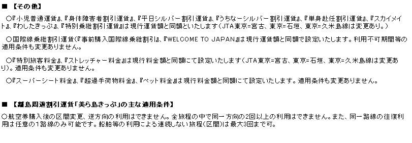 5.「普通運賃」「往復割引」 運賃額については、2001年度と同額で設定いたします。但し、JTAの東京=久米島/宮古/石垣の各路線については、航空機燃料税の引き下げ (注)平成14年度税制改正において3路線に係る航空機燃料税の税率を軽減することが閣議決定され、平成14年4月1日から適用される見込みです。