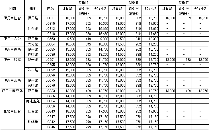 2.「前売り21」:一部変更 設定期間:2002年9月1日〜13日、17日〜20日、24日〜30日ご搭乗分 設定路線:羽田=鹿児島線 【運賃額】