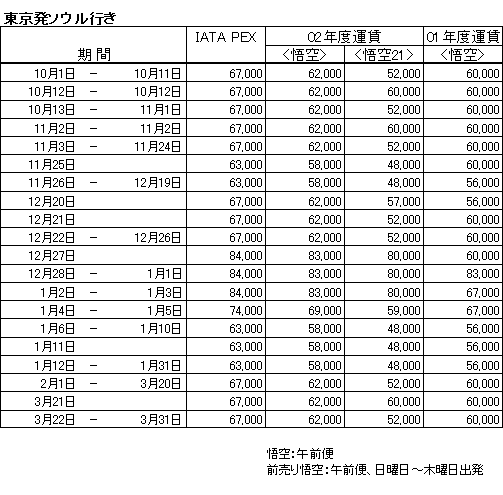 添付資料 1:運賃例−東京発 ソウル・ホノルル・グアム・ロサンゼルス・ニューヨーク・ロンドン行きの各悟空運賃 2:<スペシャル悟空>運賃の概要 3:日本発韓国行きJASスーパーペックス・JASスーパーペックス21運賃表