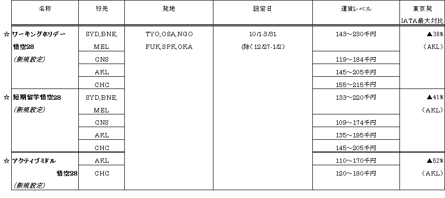 ・<スーパー前売り悟空>(ハワイ・ラスベガス・ミクロネシア行き) ・<ロングステイ悟空35>(ハワイ行き) ・<学割悟空28>(米大陸およびメキシコ行き)新設 ・<ワーキングホリデー悟空28>(オセアニア行き)新設 ・<短期留学悟空28>(オセアニア行き)新設 ・<アクティブミドル悟空28>(ニュージーランド行き)新設