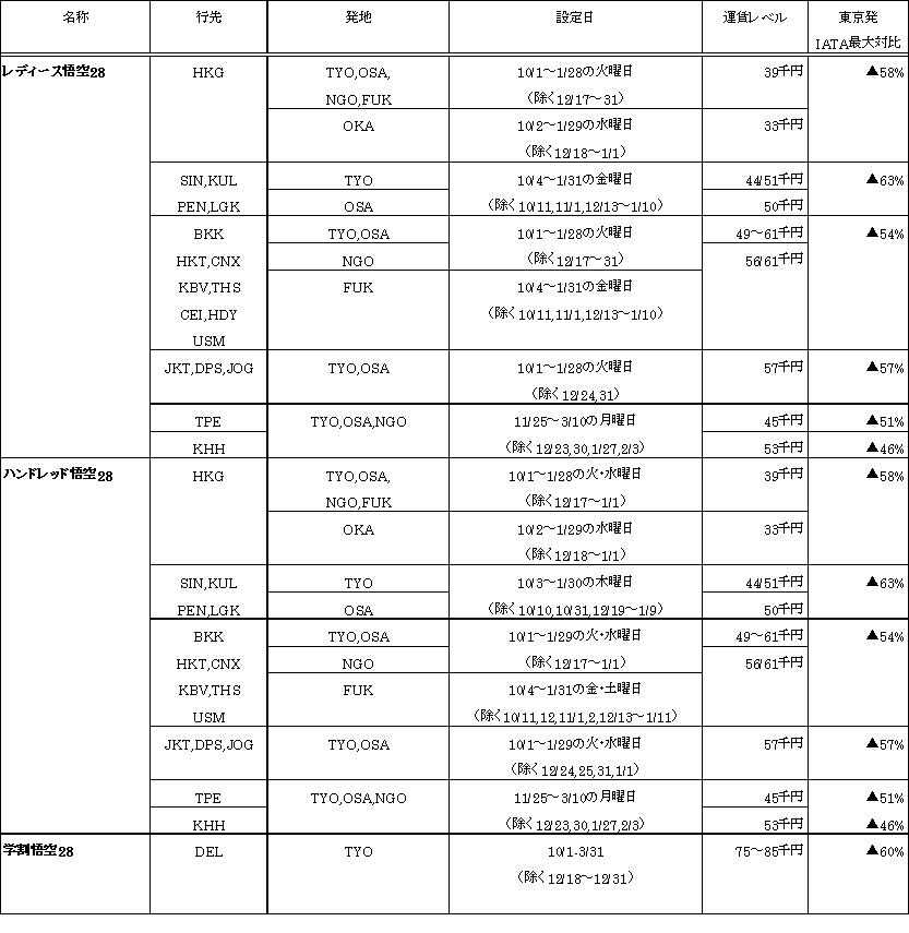 4.お求め易いJAL「スペシャル悟空」を継続設定致します! 好評のハンドレット悟空28に台湾行きを新設し、さらに設定日数を倍増して充実を図りました。また、お馴染みのレディース悟空28、 学割悟空28(デリー行き)も継続設定し、引き続き大変お買い求め易く致しました。 ・<ハンドレット悟空28>(アジア行き):合計年齢100歳以上となるお二人様に ・<レディース悟空28>(アジア行き):2名以上の女性グループのお客様に ・<学割悟空28>(デリー行き):出発時に12歳以上26歳未満の学生のお客様に