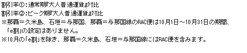 日本トランスオーシャン航空(JTA、本社那覇市、社長 市ノ澤武士)と琉球エアーコミューター(RAC、本社同上、社長 山田 有)は、 本日、11月1日〜30日ご搭乗分の「特便割引」を設定し、併せてインターネット割引「e割」の設定路線拡大、事前購入割引「前売り21」の 追加値下げも決定致しました。