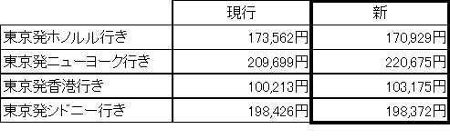 1.日本発運賃の主な改定内容(政府認可条件) (1)北米・カリブ線 ・普通運賃改定 ファーストクラス:3%、ビジネスクラス:3%、エコノミークラス(Y2除く):2% 値上げ ・週末運賃の導入【日本発:日・月、北米・カリブ発:金・土】 平日運賃+20,000円/片道(ハワイ行きおよびY2除く) (2)アジア・オセアニア線 ・普通運賃改定 ファーストクラス:3%、ビジネスクラス:3%、エコノミークラス(Y2含む*):3% 値上げ *グアム・北マリアナ諸島行きY2運賃は除く