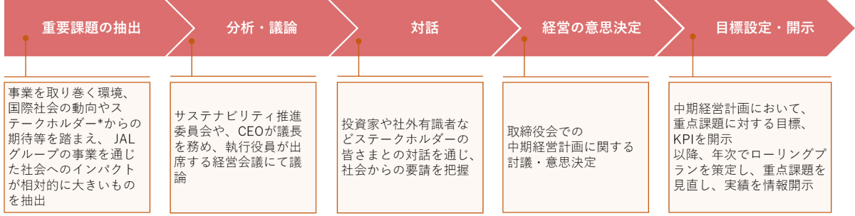 JALグループでは、進捗状況や環境変化を踏まえて、中期経営計画の戦略や計画を軌道修正し、具体化するために、毎年ローリングプランを策定しており、その中で重要課題も年次で見直しています。なお、中期経営計画ローリングプランは、取締役会で議論し、決議しています。