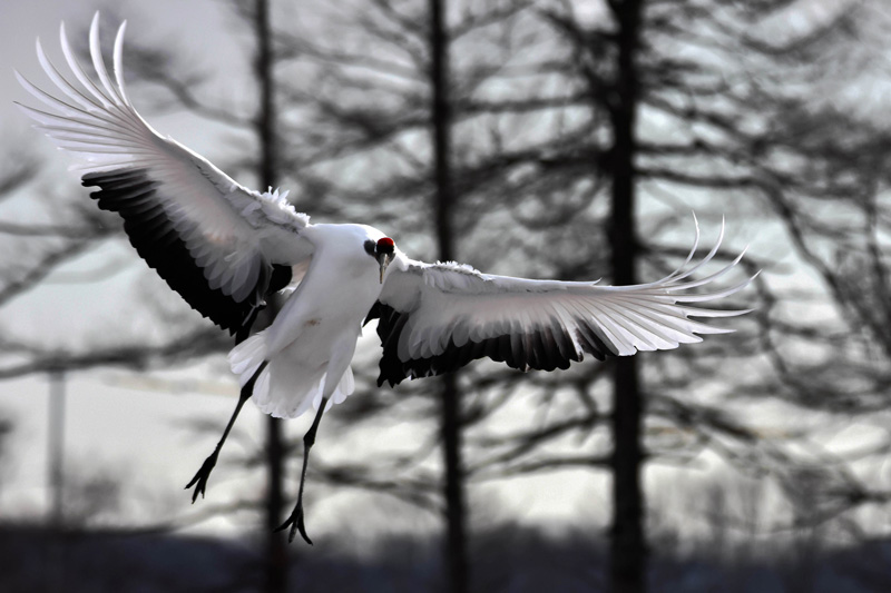 寒さ厳しい冬の北海道。今にも雪が降り風が吹きそうな空模様の中から、一羽のタンチョウがふわりと舞い降りてきました。その姿は優美で、軽やかで、冬の神そのものでした。