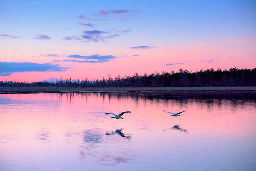 ピンクに染まった湖面と夕陽、そしてタンチョウの三つ巴のコントラストが最高の場面を演出しています。思わず引き込まれてしまいそうな自然が作り出した色合いの作品です。