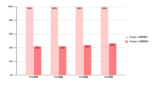 最新鋭の低騒音機材への更新を進めています。現在、保有する機材は全て「ICAO Chapter 4(厳しい騒音基準)」に適合しており、さらにその基準を厳格化した最新基準「Chapter 14」に適合する機材比率も44%(2024年度)に達しています。