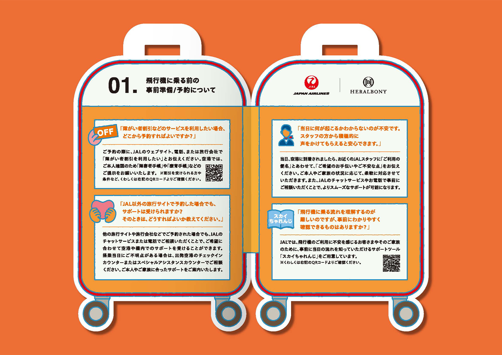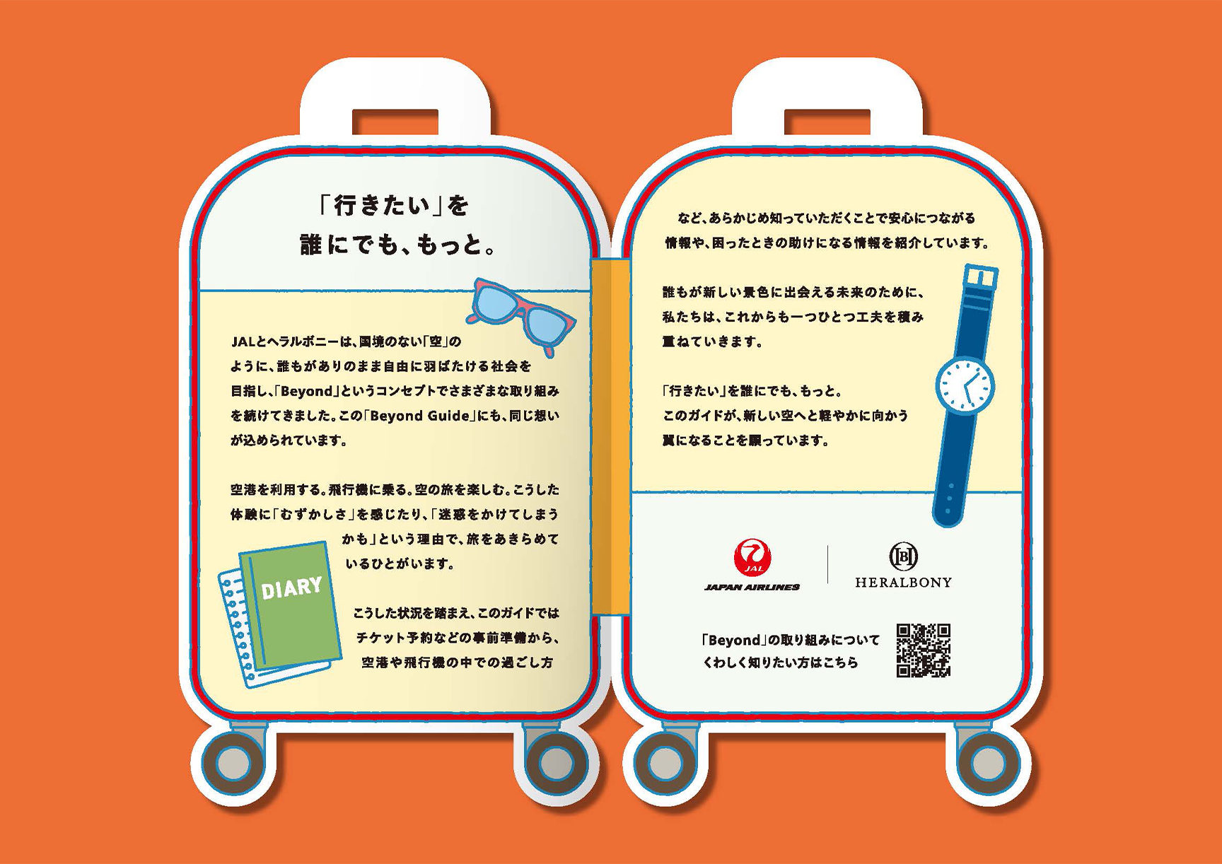 こうした状況を踏まえ、JALとヘラルボニーは一人でも多くの方の「旅をしたい」という気持ちに寄り添うため、Q&A形式で不安や疑問に応えるガイドブック「Beyond Guide」を制作しました。
