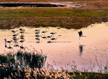 - 湿地で餌を探る多くのコウノトリ。湿地環境が大切な餌場であることが再認識できます。