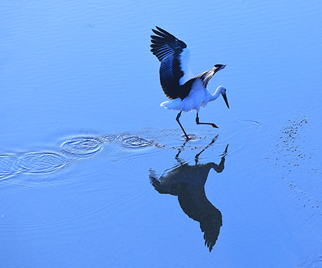 - かわいい足の動きの瞬間を捉えています。水面に残った波紋とコウノトリの影の位置が絶妙で、まるでダンスを踊っているような動きを感じる素晴らしい作品です。