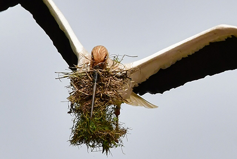子育て中のコウノトリを観察していたところ、少し離れた田畑に飛んでいった親鳥がものすごい量の巣材を咥えてこちらに向かってくるのを捉えました。