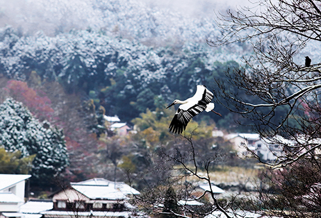 - 雪に覆われ始めた里山とコウノトリのコントラストが素晴らしい作品です。